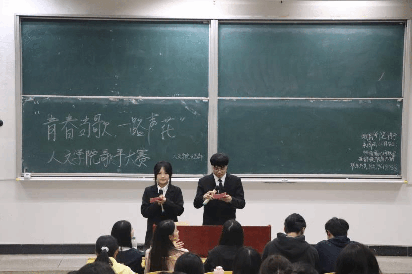 11月14日下午,人文学院“青春当歌,一路声花”院级歌手大赛在5栋104室成功举办。此次活动由人文学院团委文艺部主办,由建筑工程学院的黄岩和艺术学院的季航帆共同担任主持人。共计19位选手参与了本次比赛,人文学院100余名学生到场观赛。
