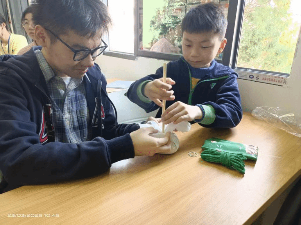 在手工制作环节,志愿者们将提前准备好的艾草、棉布、木棒、粗棉线等材料分发到孩子们手中。“艾叶要选当年新采的,捶打时要顺时针旋转……”孩子们跟着志愿者的示范,认真地将艾草绒搓成紧实的圆球,用红绳捆扎出“小锤子”的形状。