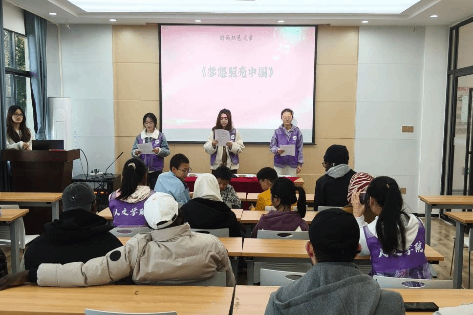 活动以红色文化浸润环节拉开序幕,氛围感十足。学生志愿者分组朗诵《祖国啊我亲爱的祖国》《梦想照亮中国》等经典篇目,激昂的语调传递出浓厚的家国情怀;《赵一曼甘洒热血沃中华》《小交通员——潘冬子》等红色故事的分享,让参与者在生动的叙事中感悟革命精神,为跨文化理解筑牢精神根基。