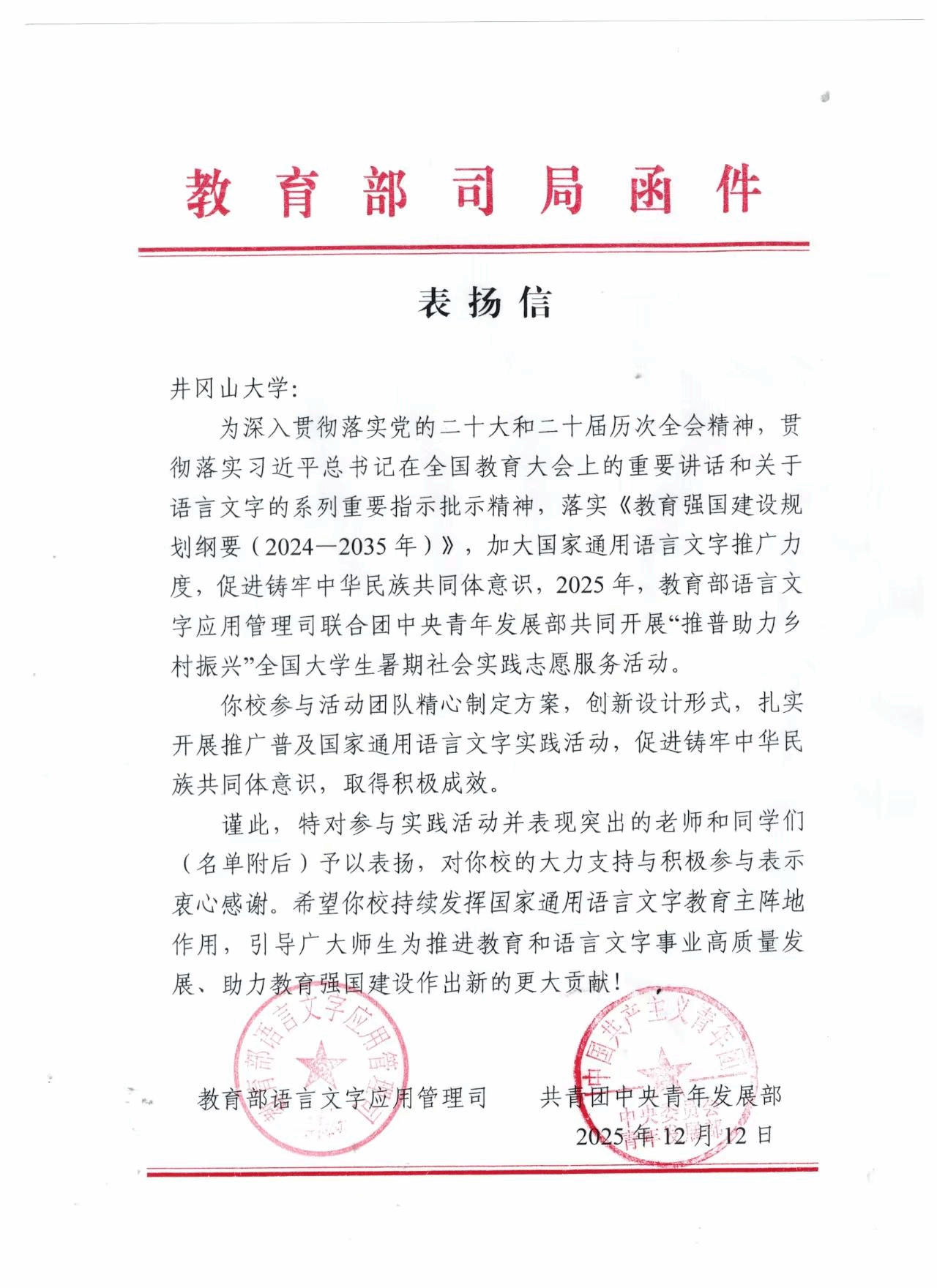 近日,教育部、共青团中央联合发布表扬通报,我院“推普助力乡村振兴”社会实践志愿服务团队凭借扎实的服务成效与突出的奉献精神,成功入选全国优秀团队名单,这也是学校志愿服务团队第二次斩获此项国家级荣誉。