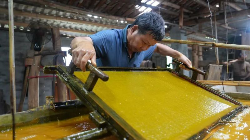 与此同时,在永丰县中村乡玉扣纸传承基地,导师巫龙生将竹帘浸入纸浆,手腕轻抖间,一张薄如蝉翼的玉扣纸已然成型。学生们体验着纸浆沉淀、竹帘抄纸的工序,千年技艺在指尖复苏。